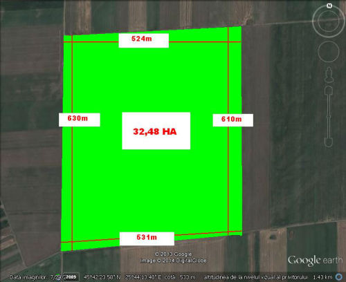 Vand 32.48 ha la Prejmer.Terenul se afla vis-a-vis de Parcul Industrial Prejmer la 500 de metri in interior.Terenul este in acest moment in extravilan cu regim agricol dar,cu intocmirea documentatiei necesare(PUZ) i se pot schimba atat regimul juridic cat si destinatia.Mentionez ca terenul nu are vicii acsunse cum ar fi conducte de gaz,cabluri de inalta tensiune,are toate actele necesare vanzarii si apartine unui singur proprietar.Pretul este 10 euro/mp.