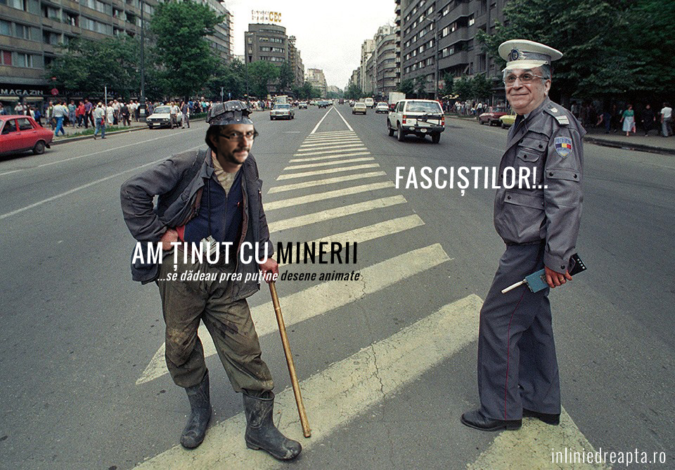[…] am văzut la televizor că minerii făceau ravagii în Bucureşti. Normal. Doar golanii începuseră primii. Am strîns puţin din ochi la primele imagini cu tineri prinşi şi bătuţi groaznic. Dar am trecut peste destul de uşor […] Iliescu ne-a eliberat de Ceauşescu, cum îşi permit ăia din Piaţa Universităţii să o ţină langa cu folk (folk!)!? […] Ţara asta era compusă 90% din mineri în cuget şi-n simţiri. Bucureştenii i-au întâmpinat cu bucurie şi flori […] în anii 90, pe cînd eram prepuber, am ţinut cu minerii pentru că vroiam linişte şi program normal la televizor.” … sau, în timpul protestelor din 2012 care au dus la ceea ce, după toate exigențele poate fi numit o “lovitură de stat”: “Aş vrea să-i văd [pe mineri] în Bucureşti lipindu-se de manifestaţiile de la Piaţa Universităţii [pentru a-l da jos pe tiranul Băsescu].”
