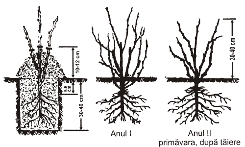 • Plantarea se face in gropi sau rigole. Gropile se realizeaza manual, dupa pichetarea terenului, sau mecanizat, la dimensiunile de 45/45/30 cm. Deschiderea rigolelor se realizeaza cu un plug special la adancimea de 32-35 cm. inainte de plantarea materialului saditor se executa o fertilizare la groapa sau pe rigola folosind 5-6 kg gunoi de grajd bine fermentat, 30-40g superfosfat, 20-25g sulfat de potasiu si 15-20g azotat de amoniu.