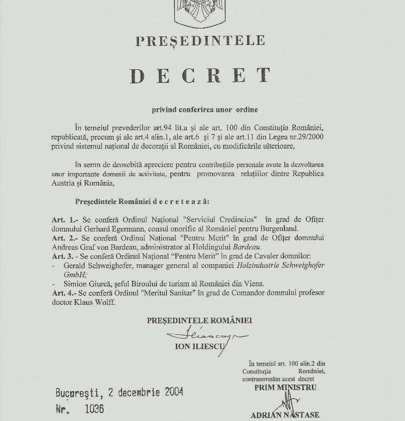 Sā nu uitām, Gerald Schweighofer a fost decorat în grad de … Decretul de decorare a lui Schweighofer semnat de Iliescu şi Năstase